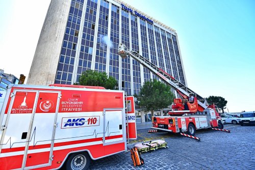 İzmir Büyükşehir Belediyesi İtfaiye Dairesi Başkanlığı, İtfaiye Haftası etkinlikleri kapsamında Cumhuriyet Meydanı’ndaki Türk Telekom Binası’nda bir yangın söndürme ve kurtarma tatbikatı düzenledi.
