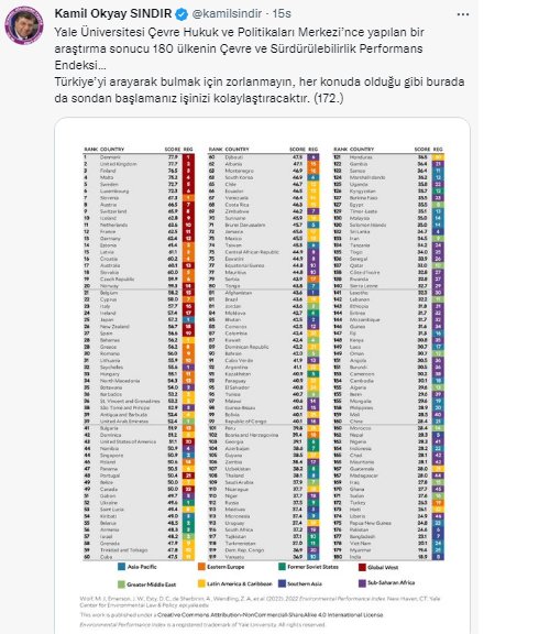Sındır paylaşımında, "Yale Üniversitesi Çevre Hukuk ve Politikaları Merkezi’nce yapılan bir araştırma sonucu 180 ülkenin Çevre ve Sürdürülebilirlik Performans Endeksi… Türkiye’yi arayarak bulmak için zorlanmayın, her konuda olduğu gibi burada da sondan başlamanız işinizi kolaylaştıracaktır. 172!" ifadelerine ifadelerine verdi.