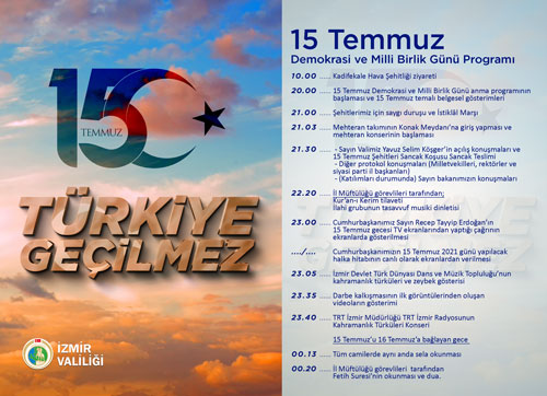 İzmir Valiliği, bu yıl 5. kez idrak edilecek 15 Temmuz Demokrasi ve Millî Birlik Günü ile ilgili program içeriğini kamuoyuyla paylaştı.