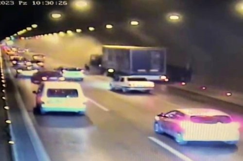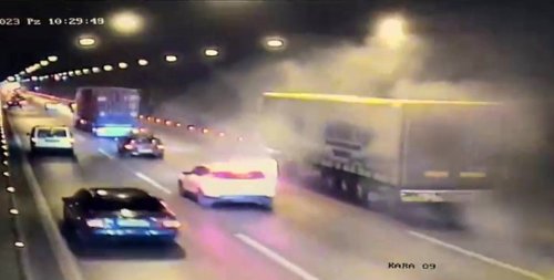 Öte yandan meydana gelen yangın anı, tüneldeki güvenlik kamerası tarafından görüntülendi. Görüntüde dumanların geldiği tırın yol kenarına yanaştığı ve sürücüsünün araçtan indiği anlar yer aldı.