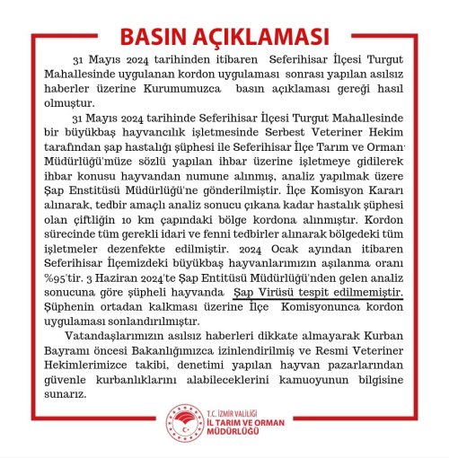 İzmir Valiliği tarafından yapılan yazılı açıklamada, "31 Mayıs 2024 tarihinde Seferihisar ilçesi Turgut Mahallesi'nde bir büyükbaş hayvancılık işletmesinde Serbest Veteriner Hekim tarafından şap hastalığı şüphesiyle Seferihisar İlçe Tarım ve Orman Müdürlüğümüze sözlü yapılan ihbar üzerine işletmeye gidilerek ihbar konusu hayvandan numune alınmış, analiz yapılmak üzere Şap Enstitüsü Müdürlüğü'ne gönderilmiştir. İlçe Komisyon Kararı alınarak, tedbir amaçlı analiz sonucu çıkana kadar hastalık şüphesi olan çiftliğin 10 kilometre çapındaki bölge kordona alınmıştır. Kordon sürecinde tüm gerekli idari ve fenni tedbirler alınarak, bölgedeki tüm işletmeler dezenfekte edilmiştir. 2024 Ocak ayından itibaren Seferihisar ilçemizdeki büyükbaş hayvanlarımızın aşılanma oranı yüzde 95'tir. 3 Haziran 2024'te Şap Enstitüsü Müdürlüğü'nden gelen analiz sonucuna göre, şüpheli hayvanda şap virüsü tespit edilmemiştir. Şüphenin ortadan kalkması üzerine ilçe komisyonunca kordon uygulaması sonlandırılmıştır. Vatandaşlarımızın asılsız haberleri dikkate almayarak; Kurban Bayramı öncesi Bakanlığımızca izinlendirilmiş ve Resmi Veteriner Hekimlerimizce takibi, denetimi yapılan hayvan pazarlardan güvenle kurbanlıklarını alabileceklerini kamuoyunun bilgisine sunarız" denildi.
