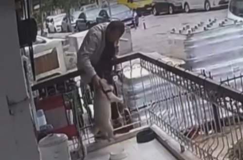 Öte yandan meydana gelen olay apartmanda bulunan güvenlik kamerası tarafından görüntülendi. Görüntüde bir kişinin korkuluklara tutunarak balkona çıktığı, daha sonra da köpeğin tasmasından tutup alarak gittiği anlar yer aldı.