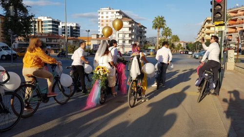 Evlenme kararı alan bisiklet tutkunu çift, nikah salonuna otomobil yerine bisikletle gitti. Arkadaşları da genç çifte bisikletleriyle eşlik edince ortaya birbirinden renkli görüntüler çıktı.