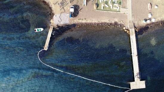 Foça’da kaynağı henüz belirlenemeyen petrol sızıntısının oluşturduğu kirlilik havadan görüntülendi.