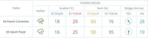 5 Kasım Pazar ise kent genelinde gök gürültülü sağanak yağışın etkili olması bekleniyor. Gün boyunca en düşük sıcaklığın 16 en yüksek sıcaklığın ise 25 derece olması bekleniyor.