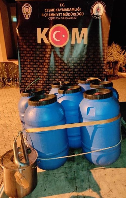 Urla'da bir bağ evinde, 1 ton kaçak olarak üretilen şarap ve etil alkol damıtma kazanı ele geçirildi.