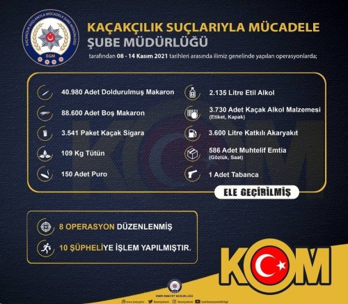 İzmir İl Emniyet Müdürlüğü Kaçakçılık Suçlarıyla Mücadele Şube Müdürlüğü ekipleri, il genelinde 8 - 14 Kasım tarihleri arasında 8 ayrı operasyon gerçekleştirdi.