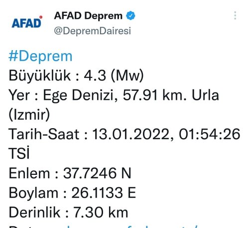 Afet ve Acil Durum Yönetimi Başkanlığı (AFAD) verilerine göre, Ege Denizi'nde merkez üssü Urla açıklarında 4.3 büyüklüğünde deprem meydana geldi. Urla'ya 57.91 kilometre mesafede gerçekleşen depremin derinliği 7.30 kilometre olarak ölçüldü. Kentte kısmen hissedilen depremde, ilk belirlemelere göre herhangi bir hasarın meydana gelmediği öğrenildi.