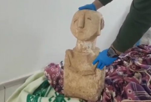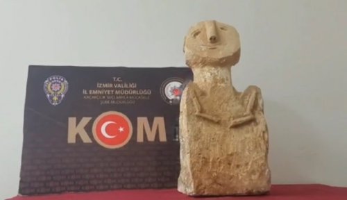 Bornova'da bir şüpheli şahsın çantasından 11 bin 500 yıl öncesine ait olduğu belirlenen insan tasvirli heykel ele geçirildi.