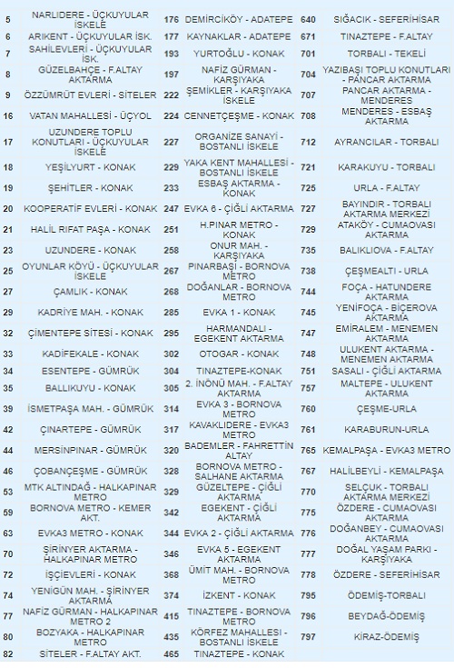 ESHOT Genel Müdürlüğü tarafından sefer başlangıç saatleri 03.30'a alınan otobüs hatlarının listesi ise şöyle: