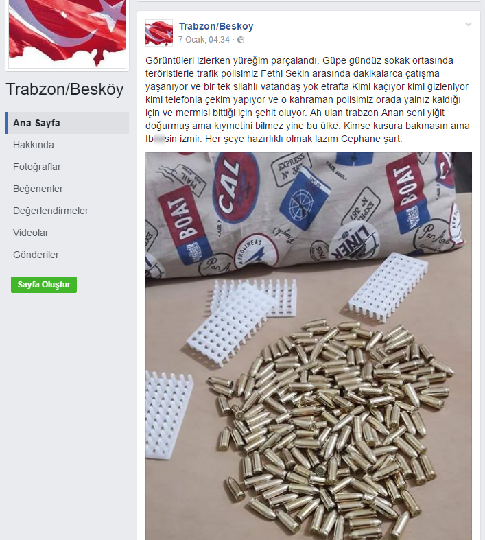 Medyaege - Oğuz Can Demirören / İzmir'de 5 Ocak'ta Adliye'ye düzenlenen polis memuru Fethi Sekin'in ve Mübaşir Musa Can'ın şehit olduğu saldırının ardından Facebook'ta Trabzon/Besköy isimli sayfadan onlarca kurşun resmi paylaşılarak İzmir'e hakaret edildiği, terör saldırısından kaçanların hedef gösterildiği ortaya çıktı.