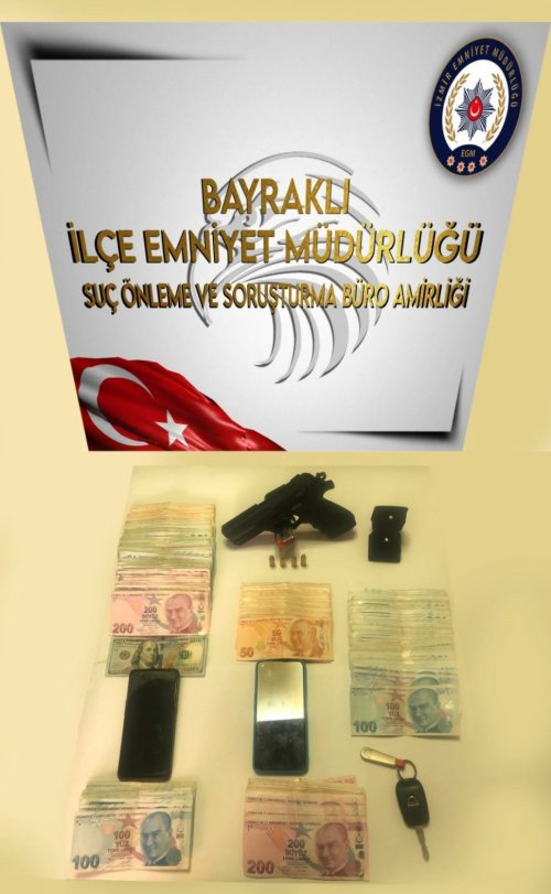 75 bin TL nakit para ve alıcıların cep telefonlarını alan iki şüpheli hızla olay yerinden kaçarak kayıplara karışırken, mağdur olan G.A. ve Ö.C., polise giderek durumu bildirdi. Polis, konuyla ilgili başlatılan soruşturma kapsamında, Ö.C., G.A. ve Ö.K.'nin ifadesine başvurdu. Polis tarafından, çevredeki güvenlik kameraları da incelemeye alınırken, sorgulama sonrası Ö.K.'nin verdiği bilgiler doğrultusunda olayı gerçekleştiren şüphelilerin kimlikleri tespit edildi. Bunun üzerine Bayraklı İlçe Emniyet Müdürlüğü Suç Önleme ve Soruşturma Büro Amirliği ekipleri, U.V. (33) ve A.D. (29) isimli şüphelilerin A.D.'nin Karabağlar ilçesinde ikamet eden sevgilisinin evinde kaldığını belirledi. Zaman kaybetmeden adrese baskın düzenleyen ekiplerce, şüpheliler kıskıvrak yakalandı. Yapılan aramalarda ise 36 bin 885 TL ve 100 dolar ile mağdurlara ait cep telefonları ve olayda kullanılan suç aleti ele geçirildi. Şüpheliler gözaltına alınarak ifadeleri alınmak üzere emniyete götürüldü.