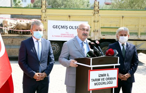 Antalya Manavgat'ta ahırları yanan vatandaşlarımızın zararlarını devletimiz karşılıyor. Ancak İzmirli hemşehrilerimiz de bu bölgelere yardım etmek istedi. İl Tarım ve Orman Müdürlüğümüz de bu talebi organize etti. Örneğin; bir hayırseverimiz 59 küçükbaş hayvanı Bergama’dan, ayrıca Bayındır’dan, Kınık’tan, Ödemiş’ten, Beydağ’dan başka vatandaşlarımız, büyükbaş ve küçükbaş hayvan hibe etti. Manavgat ve Muğla’ya gönderilmek üzere bugün burada 59 küçükbaş hayvanı sembolik olarak bir törenle yola çıkarıyoruz. Yaklaşık 50 ton yem ile birlikte 84 büyükbaş hayvan da yola çıkacak. İhtiyaç duyuldukça yine buna benzer yardımlar devam edecek. Her şeyden önce İzmirli hemşehrilerimize, hayırseverlerimize çok teşekkür ediyor, milletimiz adına şükranlarımı sunuyorum.” dedi.