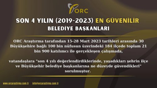 ORC araştırma tarafından yapılan çalışma 15-28 Mart 2023 tarihleri arasında, 30 Büyükşehire bağlı 100 bin nüfusun üzerindeki 184 ilçede toplam 21 bin 900 katılımcı ile gerçekleşti. Ankette, vatandaşlara; "son 4 yılı değerlendirdiklerinde, yaşadıkları şehrin ilçe ve Büyükşehir belediye başkanlarına ne düzeyde güvendikleri soruldu.