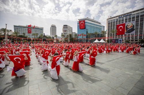 İzmir'de 23 Nisan Ulusal Egemenlik ve Çocuk Bayramı programları çerçevesinde Cumhuriyet Meydanı'nda yapılan resmi törene vatandaşların ilgisi yoğun oldu. Her yaştan öğrenci meydanda yoğunluk oluştururken meydanda yaklaşık bin 500 öğrenci sahne alıp bayraklar eşliğinde görsel bir şölen oluşturdu. Çocuk bayramını kutlamak için bir araya gelen çocuklar birbirinden renkli gösteriler sundu.