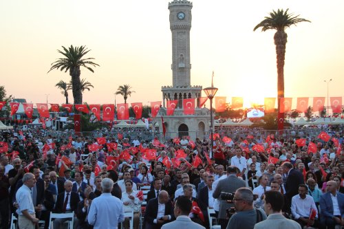İzmir'de 15 Temmuz Demokrasi ve Milli Birlik Günü'nde gerçekleşen etkinlikte Konak Meydanı vatandaşlar tarafından dolduruldu. Binlerce İzmirlinin tek yürek olduğu etkinlikte 15 Temmuz şehitleri anıldı.