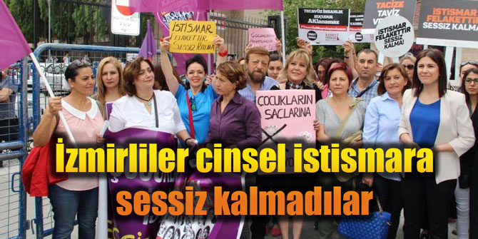 Duruşma görüleceği esnada mahkeme dışından da duyarlı İzmirli vatandaşlar ellerindeki pankartla cinsel istismarları, taciz ve tecavüzü lanetlediler.