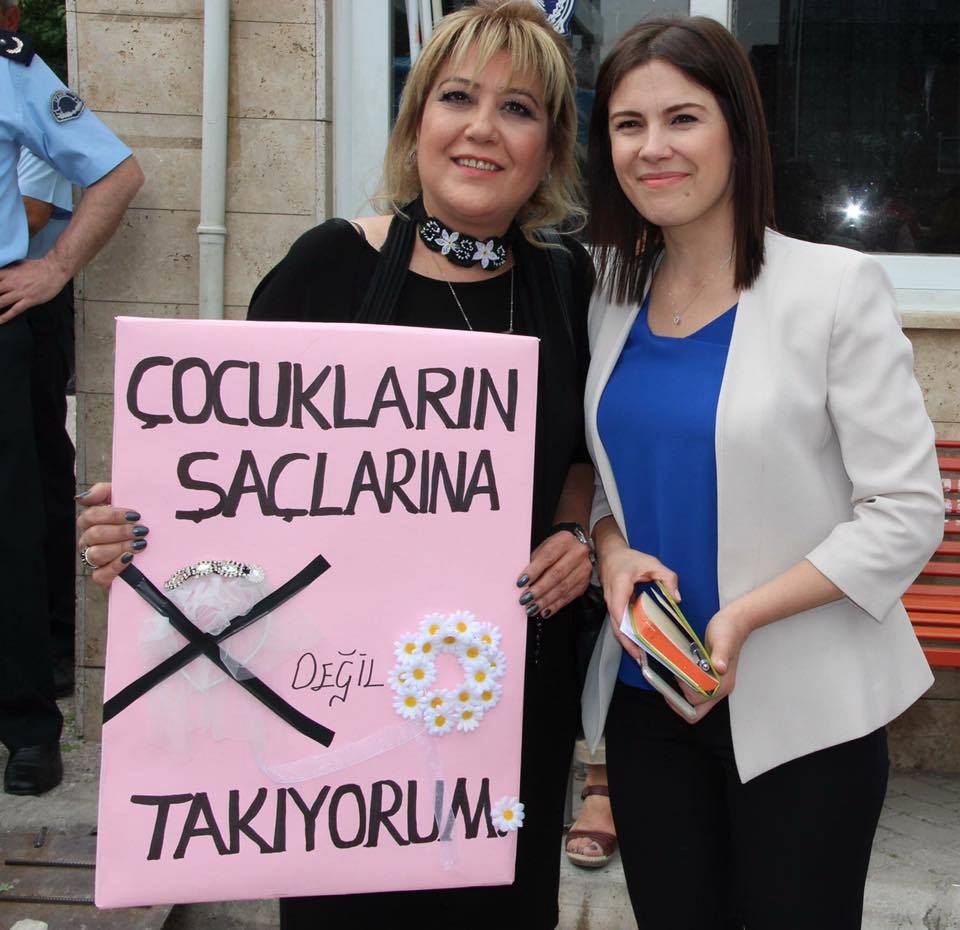 Sitemizin köşe yazarlarından Seval Alyürek de Kuaförler Odası ve CHP Konak İlçe Kadın Kolları ile birlikte "Çocuklarımızın saçlarına gelin taçları değil, papatyalar takıyorum" diyerek Saadet Öğretmen'e destek verdiler.