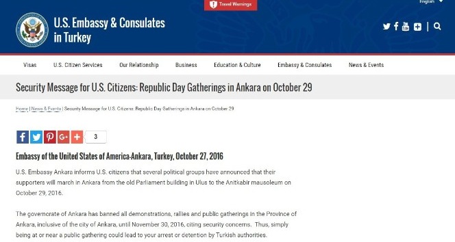 ABD’nin Ankara Büyükelçiliği, vatandaşlarına yönelik yayınladığı duyuruda İzmir’de Kordon ve Cumhuriyet Meydanı’nda yapılacak 29 Ekim Cumhuriyet Bayramı etkinlikleri için “barışçıl gösterilerin çatışmaya dönebileceği, şiddetin tırmanabileceği” uyarısında bulundu. Mesajda ABD vatandaşlarının kalabalık yerlerden uzak durması, eylem ve etkinliklerin toplanma alanlarında dikkatli olması istendi.