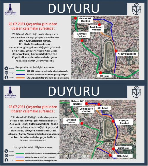 *105 numaralı Çamlıkule - Konak ve 171 numaralı Tınaztepe - Konak arasında hizmet veren otobüslerin güzergahları; Gidiş: Mevcut Güzergah - Koşu Yolu Caddesi - Menderes Caddesi - Mehmet Akif Caddesi - mevcut güzergah, Dönüş: Mevcut güzergah - Mehmet Akif Caddesi - Cemil Şeboy Caddesi - Koşu Yolu Caddesi - 272 Sk. - Mevcut güzergah şeklinde düzenlenecek.