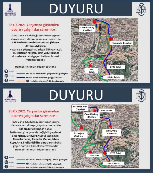 *485 numaralı Gaziemir Semt Garajı - Şirinyer Aktarma Merkezi arasında hizmet veren otobüslerin güzergahları; Gidiş: Mevcut Güzergah - 289/24 Sk. - 272/6 Sk. - Koşu Yolu Caddesi - Mevcut güzergah, Dönüş: Şirinyer Aktarma Merkezi - Koşu Yolu Caddesi - 272/6 Sk. - 289/24 Sk - Mevcut güzergah olacak şekilde düzenlenecek.