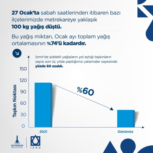 İzmir'de şiddetli yağışların yol açtığı taşkınlarının sayısının son 2 yılda yapılan yatırımlar ve çalışmalar sayesinde yüzde 60 oranında azaldığını belirten Genel Müdürlük, 2021 yılında 120ye yakın taşkın noktası bulunurken günümüzde bu sayının 40lara gerilediğini açıkladı.