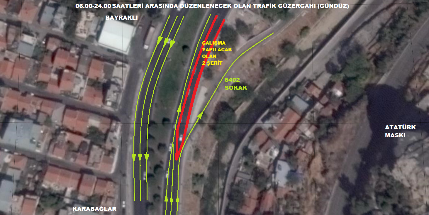 Cumartesi gününden itibaren başlayacak çalışmalar süresince Yeşildere Caddesi üzerinde, Karabağlar’dan Bayraklı ve Bornova yönüne doğru gidiş istikametindeki 3 şeritli yolun 2 şeridinde çalışma yapılırken, trafiğin bir bölümü de yeniden düzenlenen 5402 Sokak ile devamındaki 1038 Sokak üzerinden verilerek araçların yeniden Yeşildere Caddesi’ne çıkması sağlanacak. Çalışmalar gece ‘palplanj’ (derin kazılarda yol gövdesine plaka çakılması) şeklinde devam edecek. Trafik güvenliği için Bornova, Bayraklı gidiş yönünde gündüz açık bırakılan tek şerit de geceleri kapatılacak; Bayraklı tarafına gidişler 5402 Sokak üzerinden yapılacak. İZSU Genel Müdürlüğü yetkilileri, “Yenileme çalışmalarımız tamamlandığında, yeni hattan şebekeye su vereceğiz. Eskimiş hatta sıkça yaşadığımız arızalar böylece son bulacak, su kaçakları önlenecek" diye konuştu.