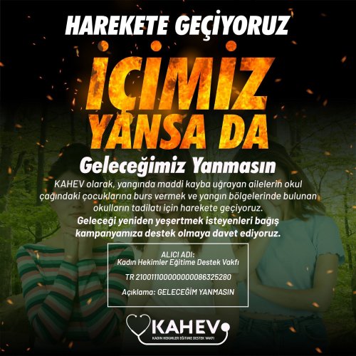 ‘İçimiz yansa da geleceğimiz yanmasın’ sloganıyla hareket eden kadın hekimler, yangında maddi kayba uğrayan ailelerin okul çağındaki çocuklarına burs vermek ve yangın bölgelerinde bulunan okulların tadilatı için harekete geçti. Geleceği yeniden yeşertmek isteyen KAHEV Başkanı Demet Başer, “Ülkemizin akciğerleri olan ormanlarımız çıkan yangınlarda büyük zarar gördü. Biz de eli kolu bağlı bir şekilde duramazdık. Çocuklar ülkemizin geleceği. Geleceğimizin de yanmaması ve çocuklarımızın felaketten en az etkilenmesi için yardım kampanyası yapmaya karar verdik” dedi.