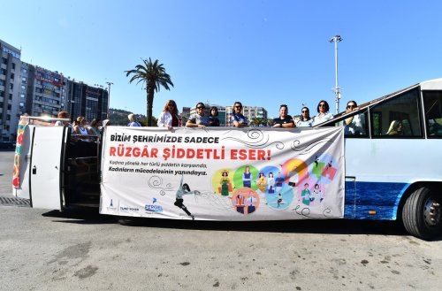 Basın açıklamasının ardından kadınlar, “Bizim şehrimizde sadece rüzgar şiddetli eser” yazısıyla giydirdikleri üstü açık otobüsle Basmane’den, Konak, Fahrettin Altay, Alsancak ve Karşıyaka’ya tur düzenledi.