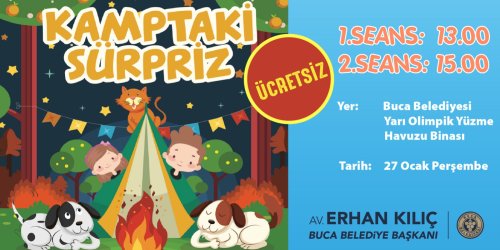 Medya Ege- Buca Belediyesi miniklerin, yarı yıl tatilini keyifli geçirebilmesi amacıyla gerçekleştirdiği etkinliklere devam ediyor. Bu kapsamda ‘Kamptaki Sürpriz’ tiyatro oyunu, 27 Ocak Perşembe günü Buca Belediyesi Yarı Olimpik Yüzme Havuzu Binası'nda iki seans halinde sahnelenecek. İlk seans 13.00'da, ikinci seans ise 15.00'da gerçekleşecek.