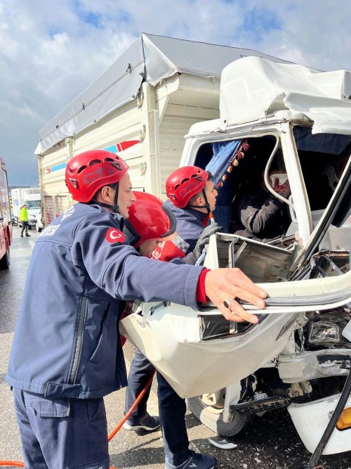 Sakarya'da D-100 kara yolu Modern Sanayi ışıklarında tıra arkadan çarpan kamyonet adeta kağıt gibi ezildi. Kamyonette sıkışarak yaralanan sürücü ile yanında yolcu olarak bulunan 2 kişi itfaiye ekiplerince kurtarıldı.