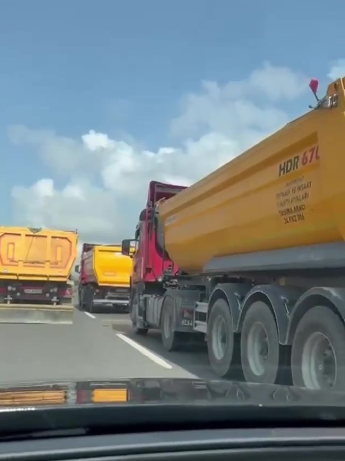 Olay, öğlen saatlerinde Şile otoyolunda meydana geldi. Edinilen bilgiye göre, otomobiliyle Şile'ye gitmek isteyen bir sürücü, 3 şeritli otoyolu hafriyat kamyonlarının kapattığını gördü.Akan trafikte kamyonları geçip ilerlemek isteyen sürücü hafriyat yüklü kamyonların hem sol şeritten hem de sağ şeritten yavaş ilerlemesinden dolayı geçemedi.Durumu cep telefonu ile videoya alan sürücü, hafriyat kamyonlarının tüm şeritleri kapatarak trafiğin yavaşlamasına ve kamyonların kazalara neden olmasına tepki gösterdi.