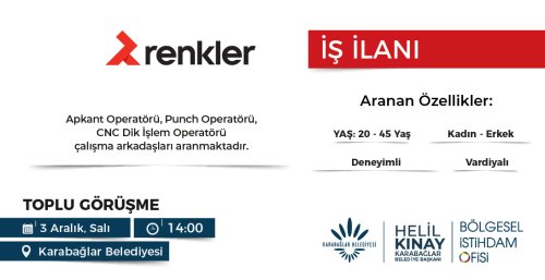 Belediyenin sosyal medya hesabından konuya ilişkin yapılan açıklamada, firmada istihdam edilmek üzere, 3 vardiyalı çalışma sisteminde; 20-45 yaş aralığında, meslek lisesi mezunu, teknik resim okuyabilen, apkant operatörü, punch operatörü, cnc dik işlem operatörü personeline ihtiyaç duyulduğu belirtilirken toplu iş görüşmesinin ise 3 Aralık Salı günü saat 14.00’te Karabağlar Belediye binasında yapılacağı aktarıldı.