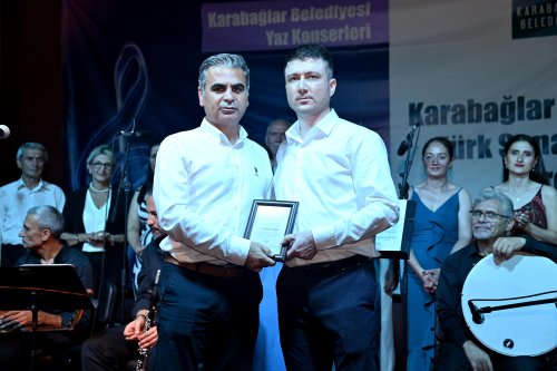 Karabağlar Belediyesi Türk Sanat Müziği Korosu'nun sanat müziğinin birbirinden güzel eserlerini seslendirdiği gecede. koristlerin solo performansı da yoğun alkış aldı. Konser sonunda Karabağlar Belediyesi Başkan Yardımcısı Yaşar Güven Güngörmüş Şef Cihan Önder’e doğa dostu fidan sertifikası verirken, koroyu da kutladı.