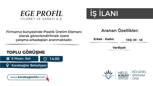 Bu kapsamda Karabağlar Belediyesi, Bölgesel İstihdam Ofisi olarak düzenlediği toplu iş görüşmelerine bir yenisini daha ekleyerek, Ege Profil firmasının çalışan arayışı için çağrıda bulundu.