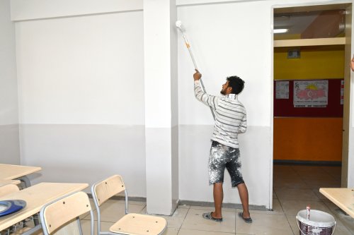 Yaz tatili devam ederken, Karabağlar'daki birçok okulda hummalı bir çalışma yürütülüyor. Yeni eğitim öğrenim dönemi öncesi çok sayıda okulun iç ve dış boyası, sıva, tesisat, kapı onarımları gibi çalışmalar gerçekleştiriliyor.
