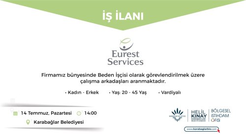 Karabağlar Belediyesi, Eurest Services iş birliğiyle beden işçisi alımı için toplu iş görüşmesi düzenliyor. 20-45 yaş arası adaylara yol ve yemek imkanı da sunuluyor.