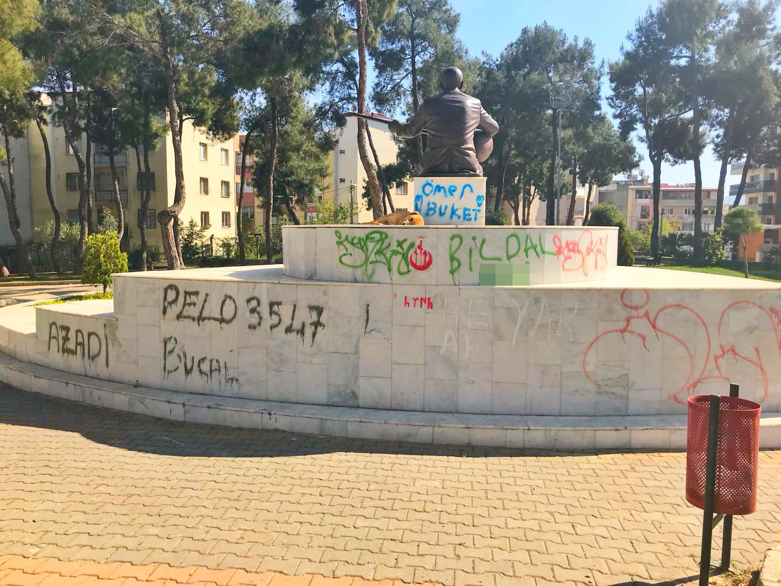 Heykelin bulunduğu alan sprey boya ile adeta yazı tahtası haline dönüştürüldü; ayrıca Neşet Ertaş'ın heykelindeki sazının burgularının da kırılarak tahrip edildiği görüldü.