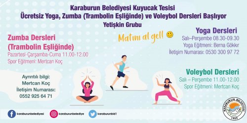 "İlçemizde yetişkinlere özel belediyemizin Kuyucak Tesisi’nde ücretsiz yoga, zumba (trambolin eşliğinde) ve voleybol dersleri başlıyor! Hafta içi Salı ve Perşembe saat 08.30-09.30 saatleri arasında yoga dersi, 11.00-12.00 arasında voleybol dersleri;