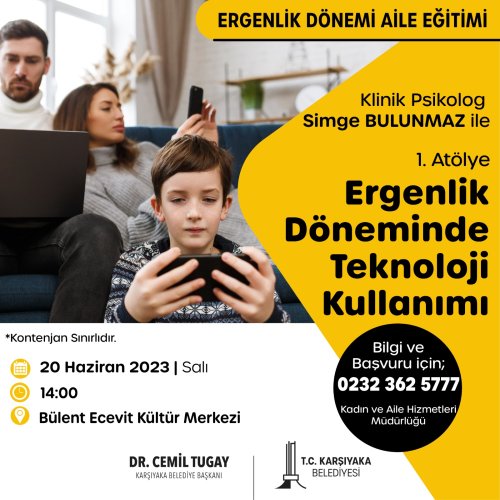 "Ergenlik döneminde teknoloji kullanımını Klinik Psikolog Simge Bulunmaz ile konuşacağız. 20 Haziran 2023 Salı günü saat 14.00'da Bülent Ecevit Kültür Merkezi'nde sınırlı kontenjanla yapılacak atölyemize 0(232) 362 57 77 numaralı hattımızdan kayıt yaptırabilirsiniz."