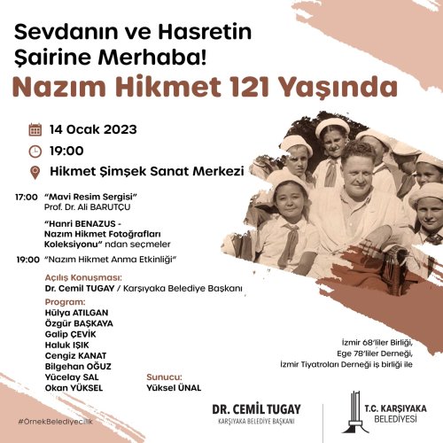 Karşıyaka Belediyesi, şair Nazım Hikmet’i ölüm yıldönümünde Sevdanın ve Hasretin Şairine Merhaba! Nazım Hikmet 121 Yaşında başlığı ile bir program düzenliyor.