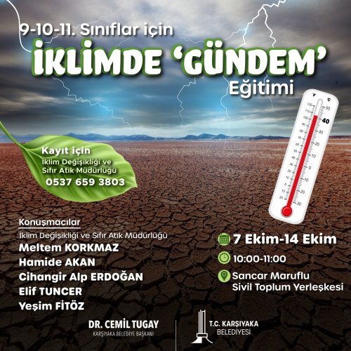 "Dünyamızı derinden etkileyen iklim krizine karşı aldığımız önlemlere toplumun her kesiminden katılımı önemsiyoruz. İklim Değişikliği ve Sıfır Atık Müdürlüğümüzün 9-10-11. Sınıflar için hazırladığı İklimde Gündem eğitimi ile genç katılımcılarımızda bu alanda farkındalık oluşturacağız. Sancar Maruflu Sivil Toplum Yerleşkesinde 7 Ekim – 14 Ekim tarihlerinde 10.00 – 11.00 saatleri arasında yapılacak eğitimimiz hakkında detaylı bilgi almak ve kayıt yaptırmak için 0(537) 659 38 03 numaralı hattımızı arayabilirsiniz."