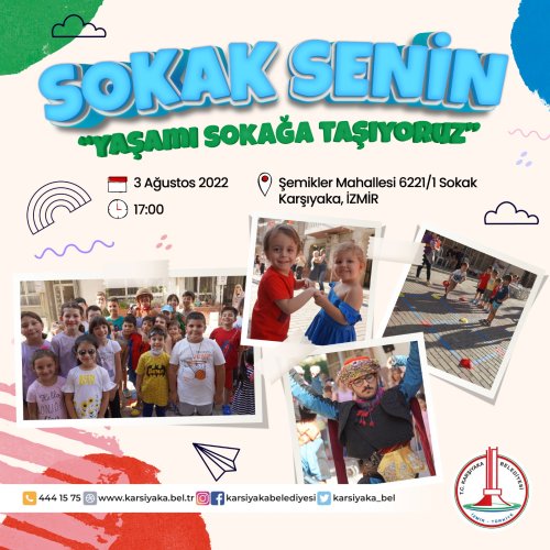 Karşıyaka Belediyesi sosyal medya hesabından konuya ilişkin yapılan paylaşımda "Sokak Senin etkinliklerimizle 3 Ağustos 2022 Çarşamba günü saat 17.00'da Şemikler Mahallesi 6221/1 Sokak'ta çocuklarımızla buluşarak doya doya oynayacağız. Sokak oyunları, boyama atölyeleri, spor aktiviteleri ve daha birçok eğlenceli etkinlik ile güzel bir gün geçireceğiz. Oyunlarımıza katılmak isteyen Karşıyakalı çocukları bekliyoruz" ifadeleri kullanıldı.