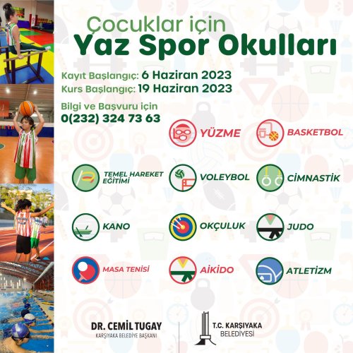 Yüzme, basketbol, temel hareket eğitimi, voleybol, jimnastik, kano, okçuluk, judo, masa tenisi, aikido ve atletizm branşlarının olacağı spor okullarımıza tüm Karşıyakalı çocukları bekliyoruz.