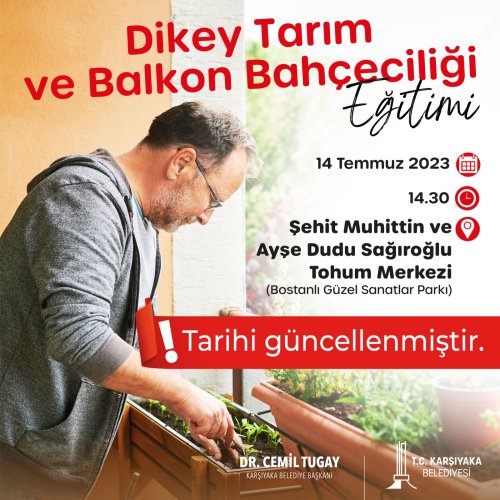 Karşıyaka Belediyesi tarafından konuyla ilgili yapılan paylaşımda; "Dikey Tarım ve Balkon Bahçeciliği Eğitimi'ni 14 Temmuz 2023 Cuma günü 14.30-15.30 saatleri arasında gerçekleştireceğiz. Şehit Muhittin ve Ayşe Dudu Sağıroğlu Tohum Merkezi'nde yapılacak eğitime tüm Karşıyakalıları bekliyoruz" ifadelerine yer verildi.