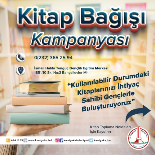 Nilda Altın Okay- Hayata geçirdiği farkındalık projeleri ile adından sıklıkla söz ettiren Karşıyaka Belediyesi, gençleri kitapla buluşturmak amacıyla kitap bağış kampanyasına başlıyor. Sosyal Yardım İşleri Müdürlüğü tarafından düzenlenen kampanyada Karşıyakalılar, bağışlamak istedikleri kullanılabilir durumdaki test, roman, hikaye gibi kitapları belirlenen merkezlere teslim edebilecek.