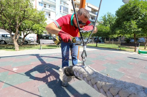 Karşıyaka Belediyesi, ilçede hasar görmüş oyun ve spor alanlarının bakım çalışmalarını sürdürüyor.