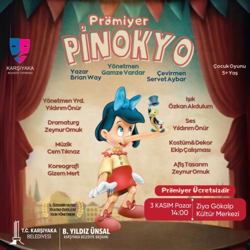 Karşıyaka Belediyesi, çocukları ve aileleri 3 Kasım Pazar günü Ziya Gökalp Kültür Merkezi’nde sahnelenecek olan ‘Pinokyo’ çocuk oyununa davet etti.