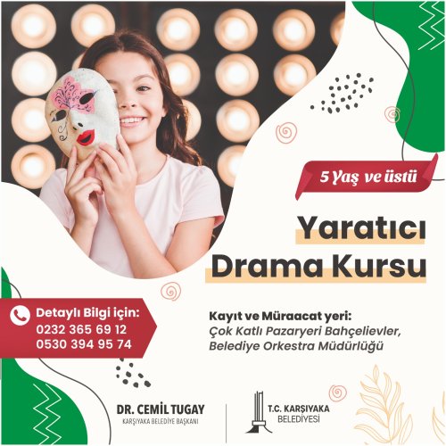 Karşıyaka Belediyesi'nin sosyal medya hesabından yapılan açıklamada; "Yaratıcı drama kursu başlıyor! Belediyemiz bünyesinde 5 yaş ve üzeri yaş grubuna yönelik düzenlenen yaratıcı drama kursu hakkında detaylı bilgi almak için 0(232) 365 69 12 veya 0(530) 394 95 74 numaralı hatlarımızı arayabilir, Belediye Orkestra Müdürlüğü’nün Bahçelievler Çok Katlı Pazaryerinde bulunan ofisine başvurarak kayıt yaptırabilirsiniz" ifadelerine yer verildi.