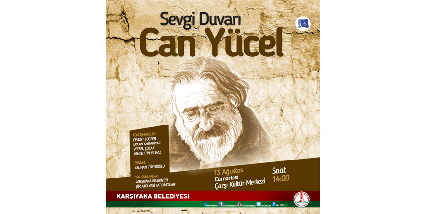 Türk Şiirinin ölümsüz ismi Can Yücel, aramızdan ayrıldığı 12 Ağustos'un ertesi günü Karşıyaka'da, şiirleriyle anılacak. Karşıyaka Belediyesi Şiir Atölyesi'nin etkinliği 13 Ağustos Cumartesi günü, 14:00'de Çarşı Kültür Merkezi'nde gerçekleşecek. Etkinlikte konuşmacılar Veysel Çolak, Cevdet Yüceer, Erkan Karakiraz ve Vahdettin Yılmaz, Can Yücel'in insan sevgisi, toplumcu kavrayışı, ironik ve keskin dilini, Türkçe'yi doğal kullanışını ve politik göndermelerini anlatarak, katılımcılara şairi daha yakından tanıma fırsatı sunacak.